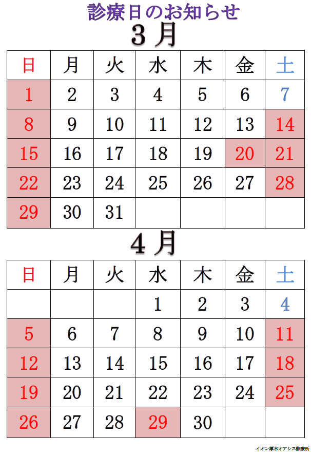 診療日カレンダー3月、4月